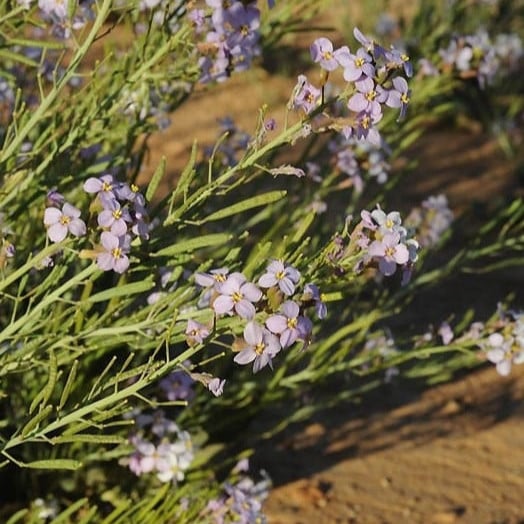 أزهاره تتكون في نهاية الأغصان ولها أربع بتلات ذات لون بنفسجي جذاب، يزهر في فصل الربيع.